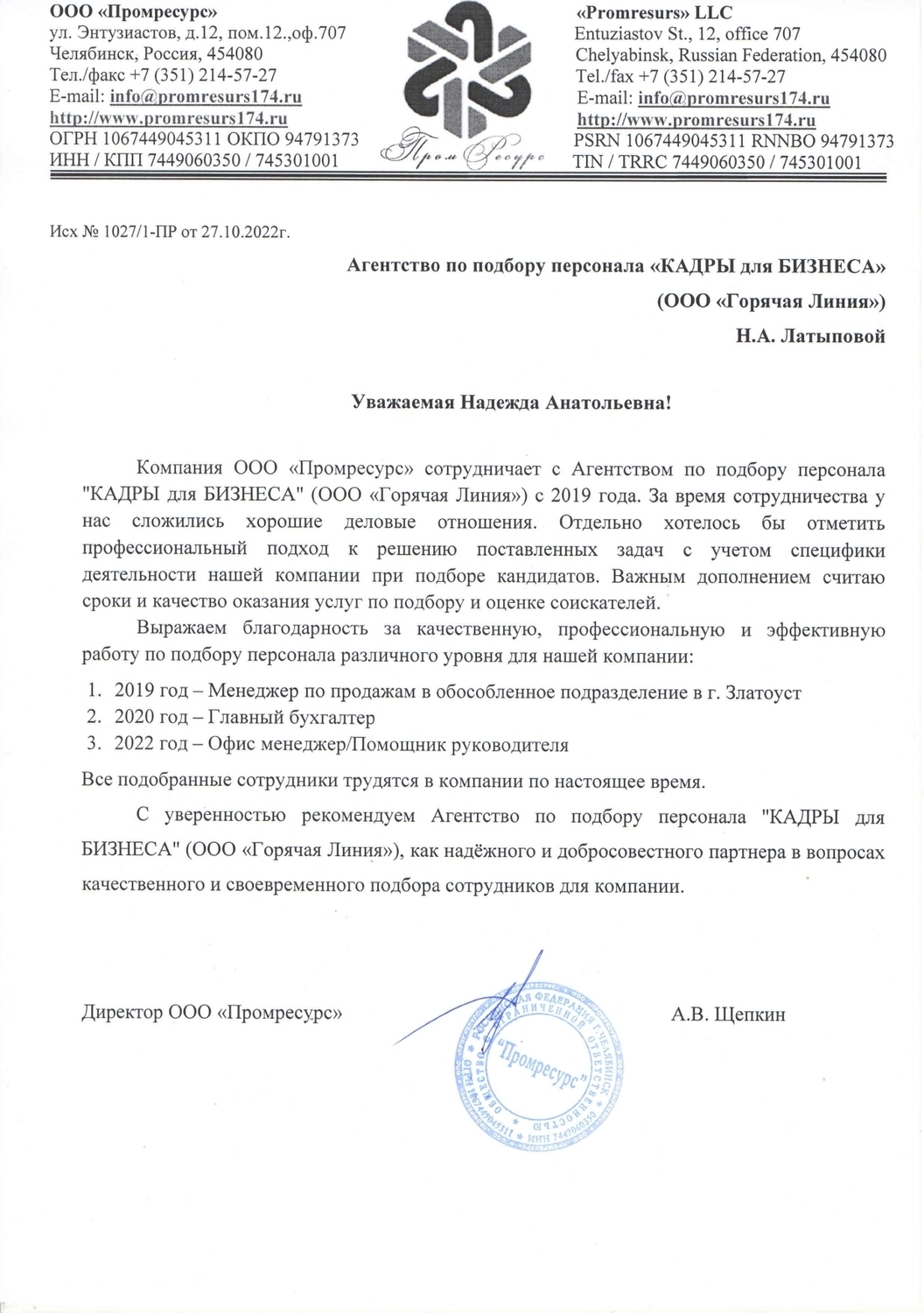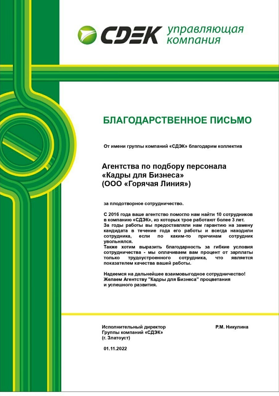 Благодарим коллектив агентства «КАДРЫ для БИЗНЕСА» за плодотворную работу. Профессионализм сотрудников, качественный сервис, забота о клиенте делает наше сотрудничество продолжительным и приятным. Коммуникация настолько эффективна и прозрачна, что не остаётся сомнений в профессионализме команды.Закрыли вакансии: сварщик, слесарь-ремонтник