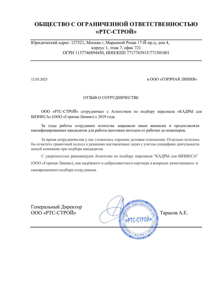 Сотрудничаем с агентством «КАДРЫ для БИЗНЕСА» с 2019 года (6+ лет). За годы работы сотрудники агентства закрыли вакансии от сварщиков до инженеров для работы вахтовым методом. С уверенностью рекомендую как надёжного и добросовестного партнёра в вопросах качественного и своевременного подбора сотрудников.