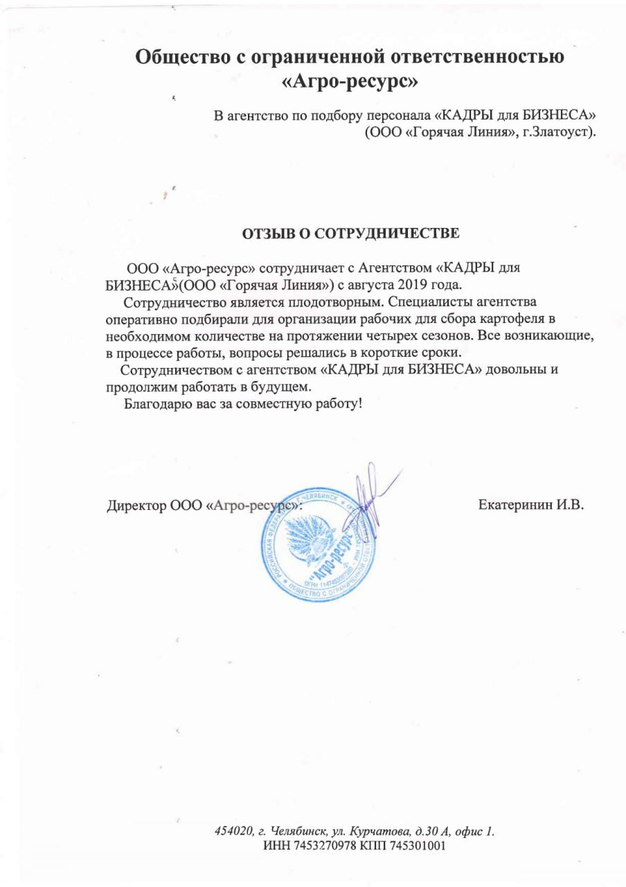 Благодарим коллектив агентства «КАДРЫ для БИЗНЕСА» за плодотворную работу. Профессионализм сотрудников, качественный сервис, забота о клиенте делает наше сотрудничество продолжительным и приятным. Коммуникация настолько эффективна и прозрачна, что не остаётся сомнений в профессионализме команды.Закрыли вакансии: сварщик, слесарь-ремонтник